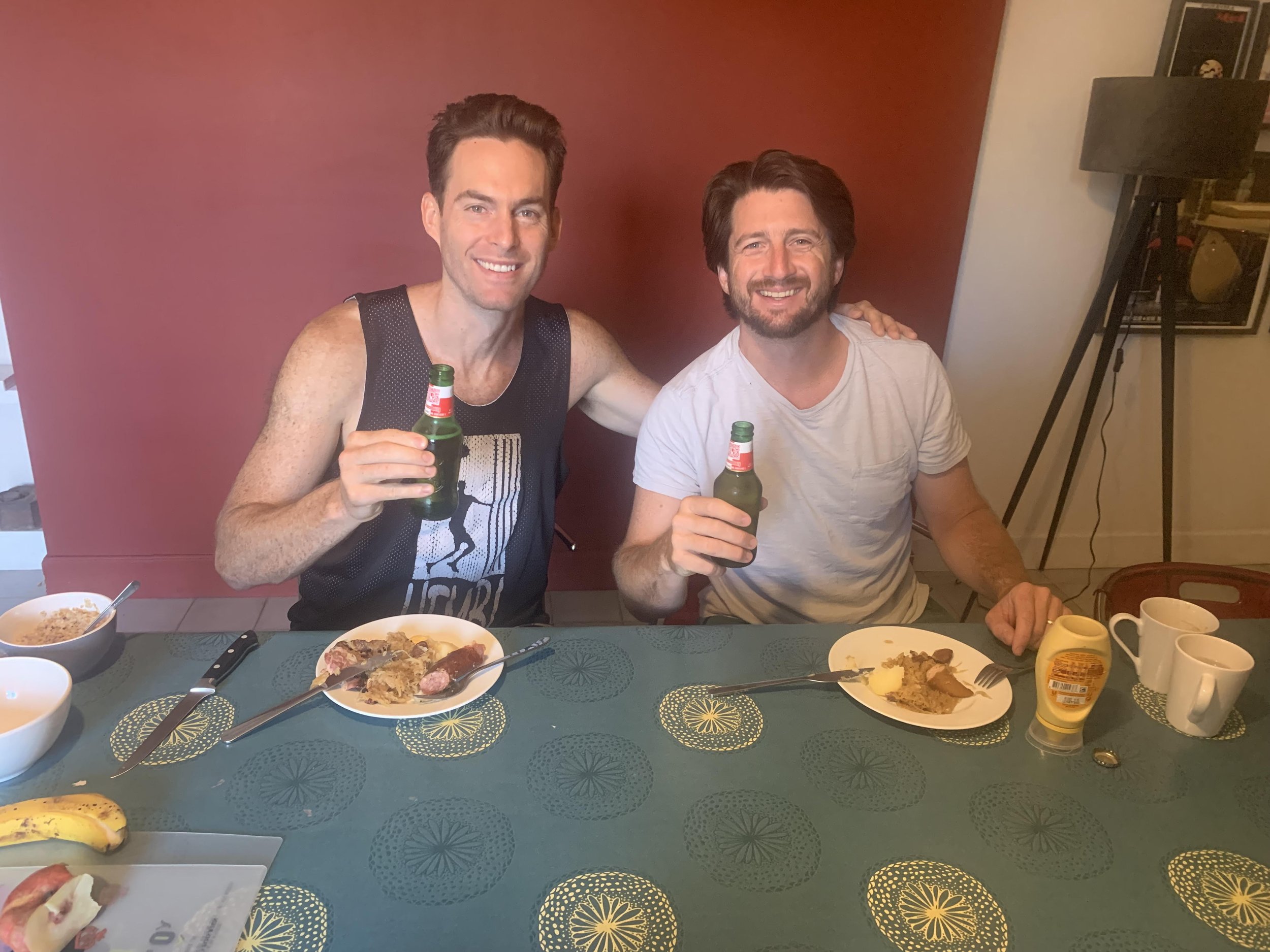 It took three consecutive meals of kraut and sausages to get these two hounds sober enough for this picture. Their relationship with sauerkraut is timeless.